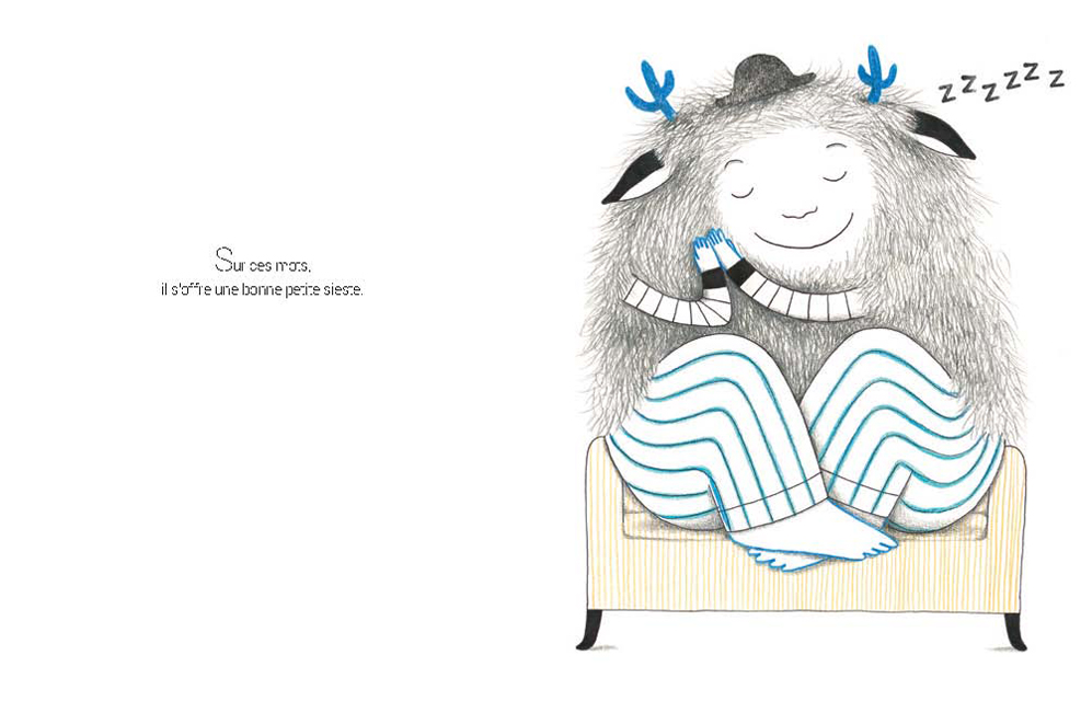 Mais notre bon gros monstre ne manque jamais de ressources pour dépatouiller des situations inextricables : il recycle un colis pour en faire un super cerf-volant, il suggère de grignoter des petits gâteaux pour chasser des pensées amères, il propose aussi une reconversion en tant que Homme invisible, et n'hésite pas à enfiler la blouse de docteur pour couvrir les plâtres des malades avec des petits dessins pour rendre la vie plus commode !